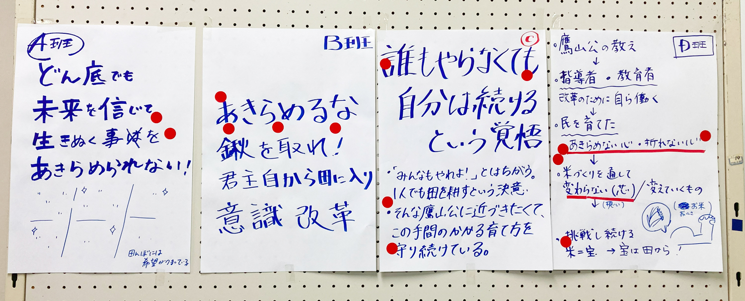 藩財政の悪化や飢饉に見舞われ働く意欲を失いかけていた領民を励まそうと、藩主自ら田んぼに入り鍬を入れ、「藉田の礼」という儀式を行った上杉鷹山公のあきらめない心。米沢稔りの会の皆さんもその精神を受け継ぎ、あきらめずにお米作りに向き合ってきたのだと伝わってきました。