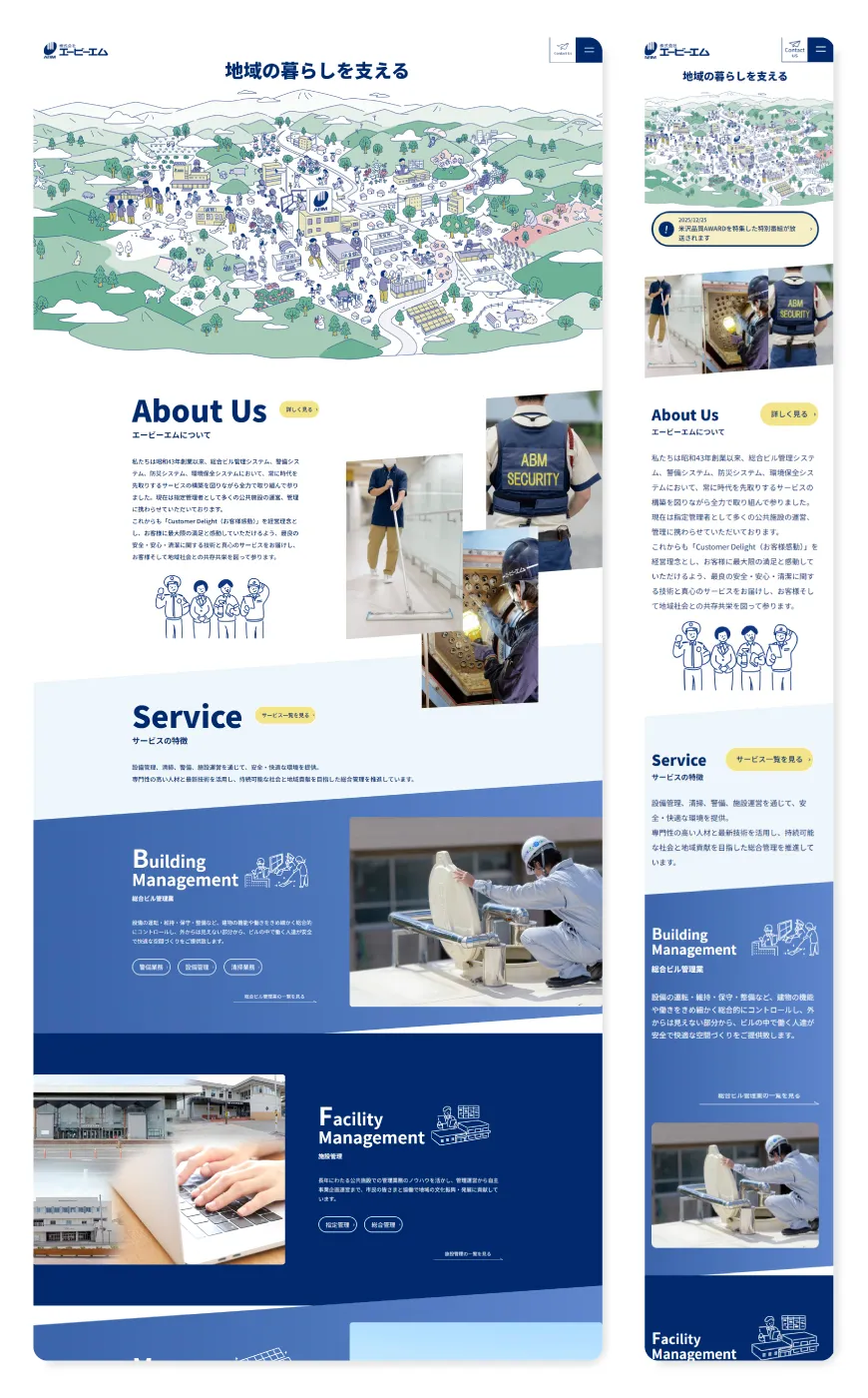 トップページでは地域の縮図としての絵地図の中にそれぞれの業務ごとに活動されているエービーエムさまの社員の姿を描き、暮らしのどの部分で活動されているかを表現しています。